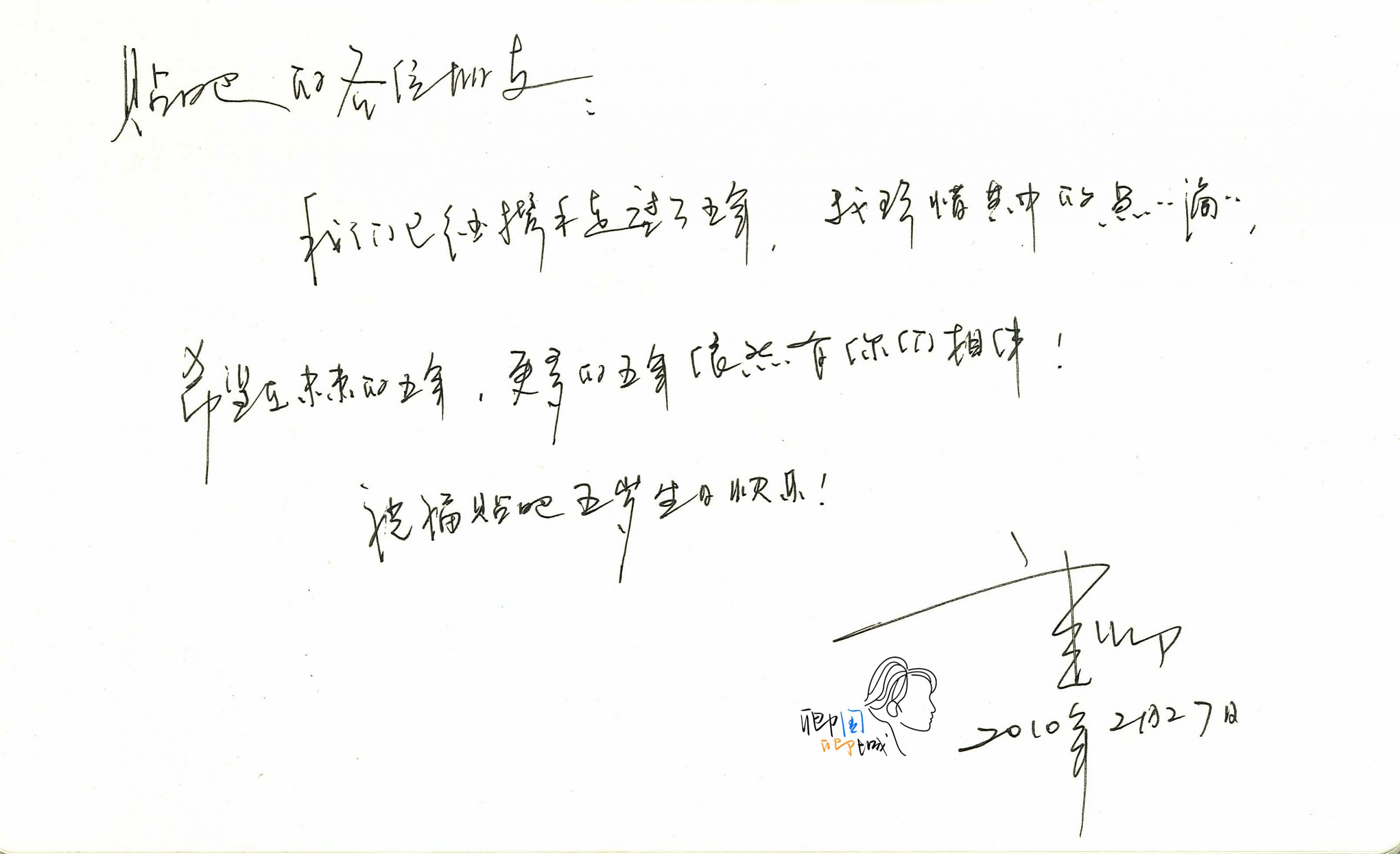 Post author:卿国卿城 Post published:2010年2月27日 Post category:董卿留言 董卿赠贴吧生日祝福手迹 2010-2-27 15:24:05 贴吧的各位朋友: 我们已经携手走过了五年,我珍惜其中的点点滴滴,希望在未来的五年,更多的五年依然有你们相伴! 祝福贴吧五岁生日快乐! 董卿2010年2月27日 董卿手写祝福 转载请注明出处 你可能也喜欢 卿卿在深圳给全体卿迷的第一条留言 2005年7月30日 2010年的新年问候 2010年2月23日